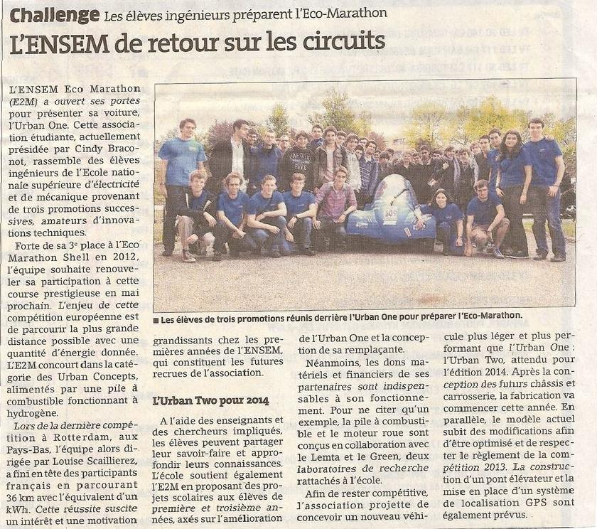 Une fois de plus accompagnée de l’Urban One, l’équipe de l’ENSEM Eco-marathon va, de nouveau concourir à la compétition qui se déroulera à Rotterdam aux Pays-Bas du 13 au 18 mai 2013.