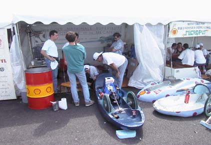 Pas de photos d’équipe non plus pour 2001. lors de cette participation, des ennuis divers et inattendus se sont succédés ce qui ne nous a pas permis de valider plus d’une tentative et au final un résultat moyen de 893 km pour un litre d’essence avec veleco02.